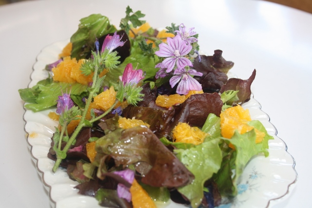 He trossejat les fulles netes dels enciams i la taronja i he tallat les flors de la tija i separat el calze. Tot amanit amb oli i vinagre (jo he posat vinagre de poma). Finalment he posat una branqueta de Malva i una de Vivàcia per adornar. Amb 5 minuts he tingut una amanida ben fresca i fàcil de fer.